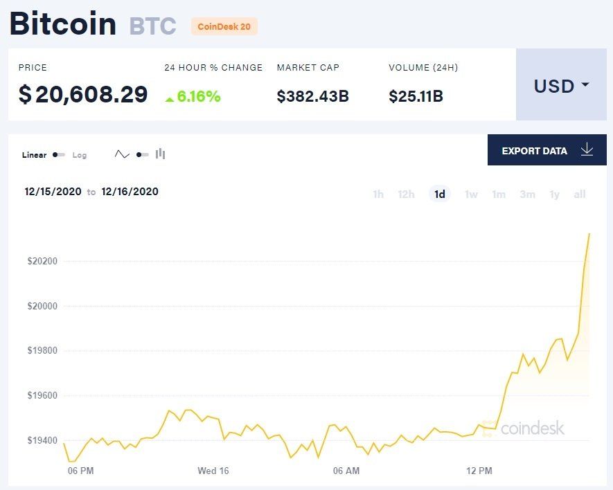 سجلت عملة “البيتكوين”، الأربعاء، مستويات تاريخية، حيث تجاوزت العملة الرقمية الأشهر في العالم مستوى 20 ألف دولار، للمرة الأولى على الإطلاق.