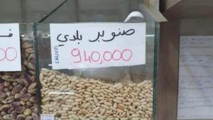 وقد وصل سعر الصنوبر البلدي إلى 940 ألف ليرة، كما يظهر في الصورة المرفقة. وقد يتخطى السعر، حتماً، المليون ليرة قريباً جداً مع استمرار ارتفاع الدولار.