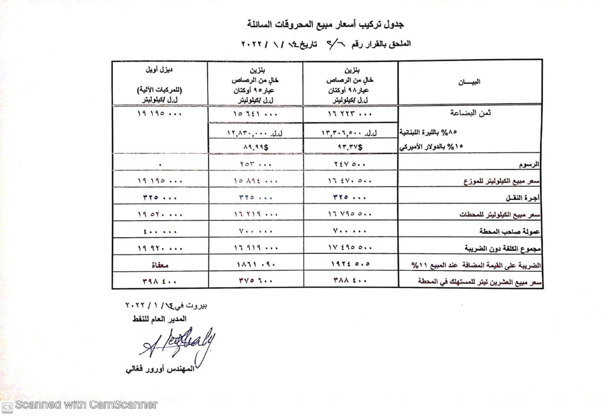 انخفض سعر صفيحة البنزين 95 و98 أوكتان 2200 ليرة والديزل أويل 11600 ليرة، وأصبحت الأسعار كالآتي: بنزين 95 أوكتان: 375600 ليرة بنزين 98 أوكتان: 388400 ليرة المازوت: 398,400 ليرة