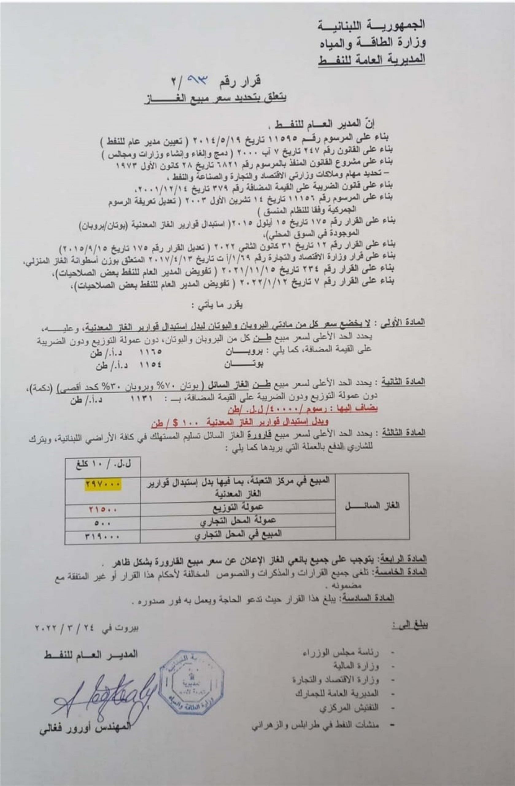 الغاز: 297,000 ليرة لبنانية (+19000)