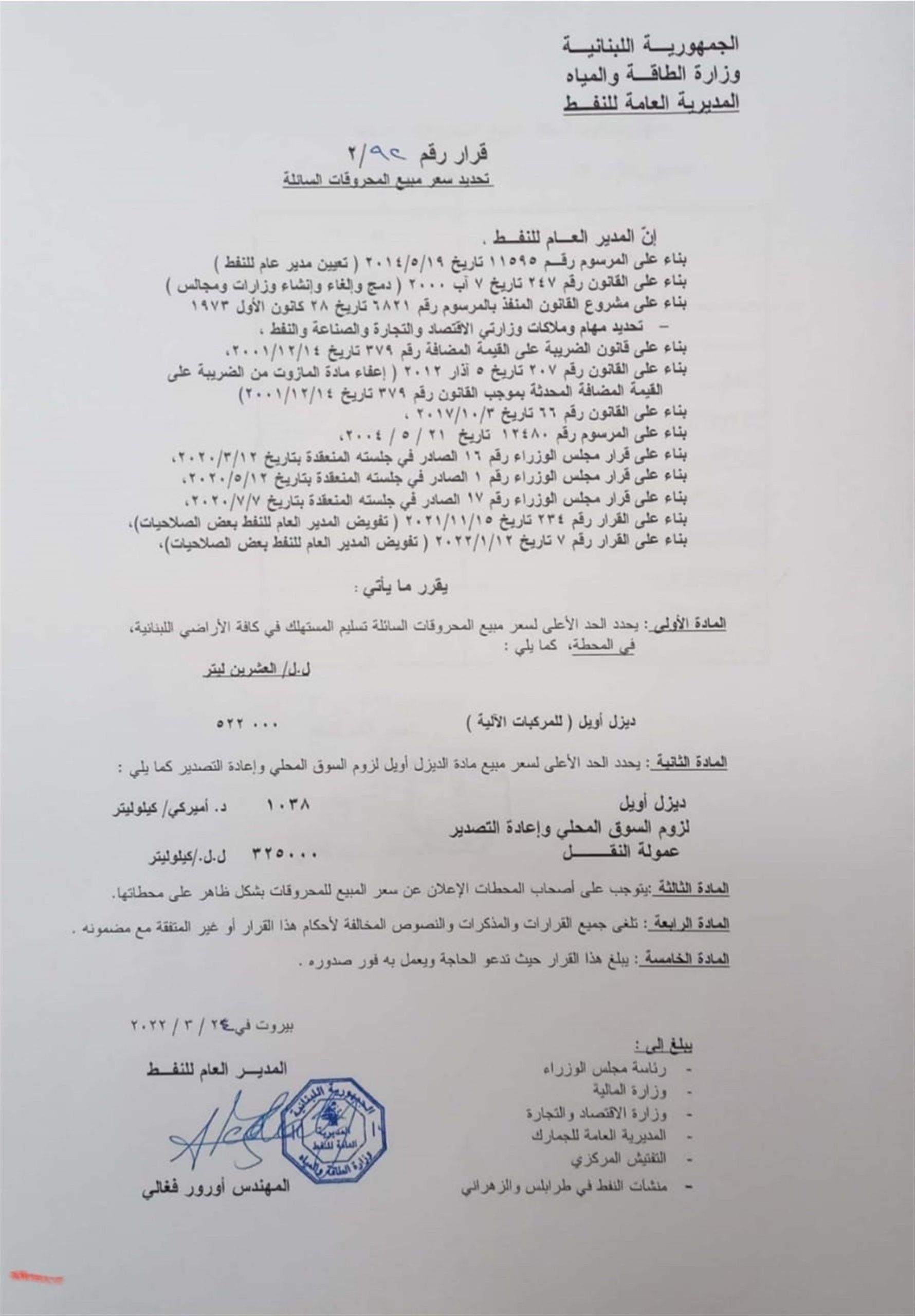 المازوت: 522,000 ليرة لبنانية (+42000)