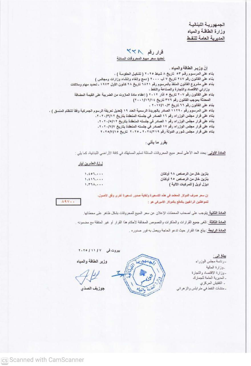 صدر عن وزارة الطاقة والمياه صباح اليوم الجمعة، جدولٌ جديد للمحروقات، وجاءت الأسعار على الشّكل التالي: