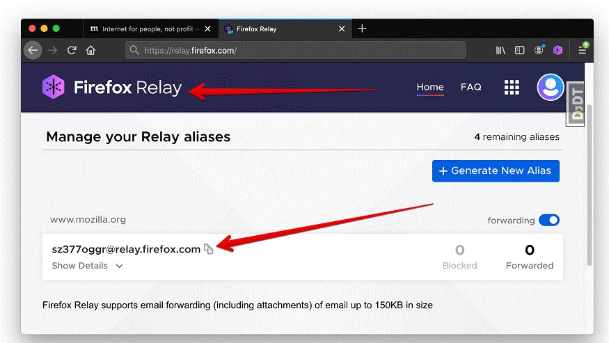 لذلك يدعم متصفح فايرفوكس إضافة (Firefox Relay) الي تعتبر الحل الذكي لحماية بريدك الإلكتروني، حيث تتيح لك إنشاء عنوان بريد إلكتروني بديل بنقرة واحدة فقط ثم توجيه الرسائل التي تصلك عليه مع الحفاظ على خصوصية بريدك الإلكتروني الفعلي. بالإضافة إلى ذلك تساعد في تقليل البريد العشوائي ومحاولات القرصنة.