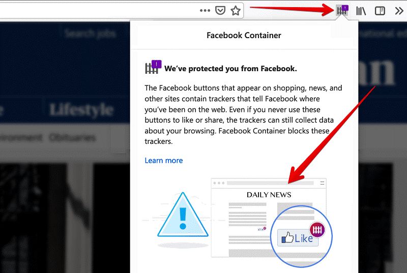 عندما تكون إضافة (Facebook Container) نشيطة، يتم حظر تتبع المحتوى التي تتفاعل معه، وبعض الوسائط المضمنة على مواقع الويب، ولكن يمكنك اختيار ما تسمح بمروره على أساس كل حالة على حدة.