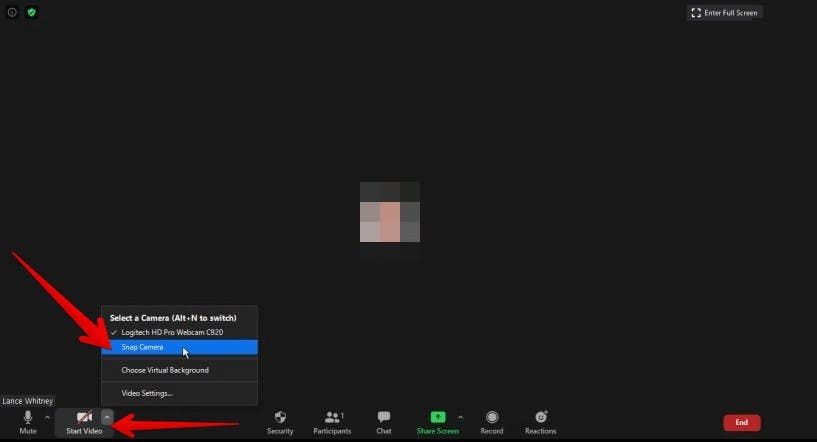• انقر على السهم الموجود بجوار زر بدء الفيديو، ثم حدد (Snap Camera) من القائمة المنسدلة للتبديل من الكاميرا الافتراضية إلى التطبيق.