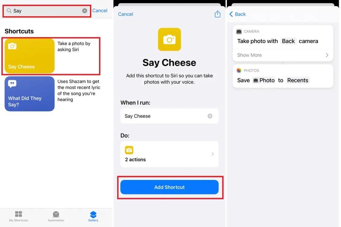 3- استخدام المساعد الصوتي Siri:يمكنك استخدام المساعد الصوتي (سيري) Siri لالتقاط الصور عن بعد، حيث يؤدي إعطاء الأمر للمساعد الصوتي إلى فتح تطبيق الكاميرا في آيفون ولكنه في الواقع لا يؤدي إلى تشغيله لالتقاط الصور، بدلاً من ذلك، يمكنك اللجوء إلى اختصار المساعد الصوتي المدمج المسمى (Say Cheese)، ولتشغيل الاختصار، اتبع الخطوات التالية: