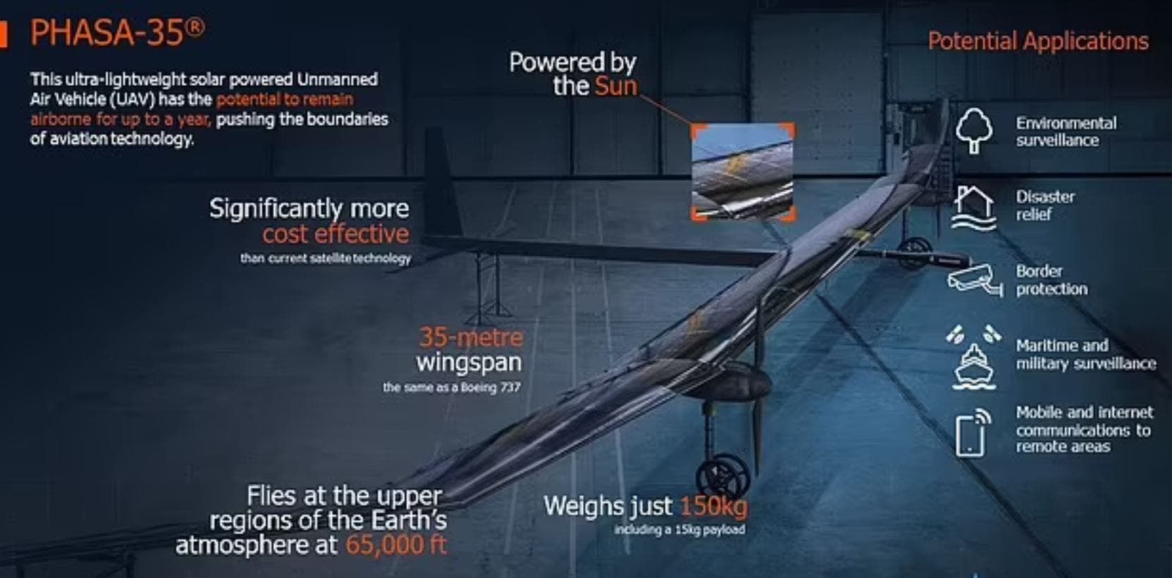 طوّر مصممون بريطانيون طائرة مسيرّة تعمل بالطاقة الشمسية قد تكون بديلاً للأقمار الصناعية، وذلك لقدرتها على البقاء في الجو لأكثر من عام دون توقف.