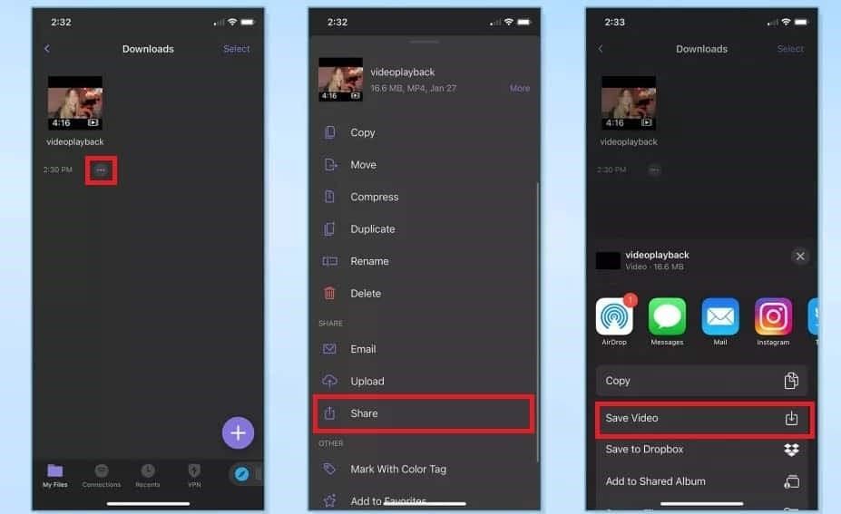 • من القائمة التي تظهر لك اضغط على خيار مشاركة ثم حدد خيار حفظ الفيديو.
