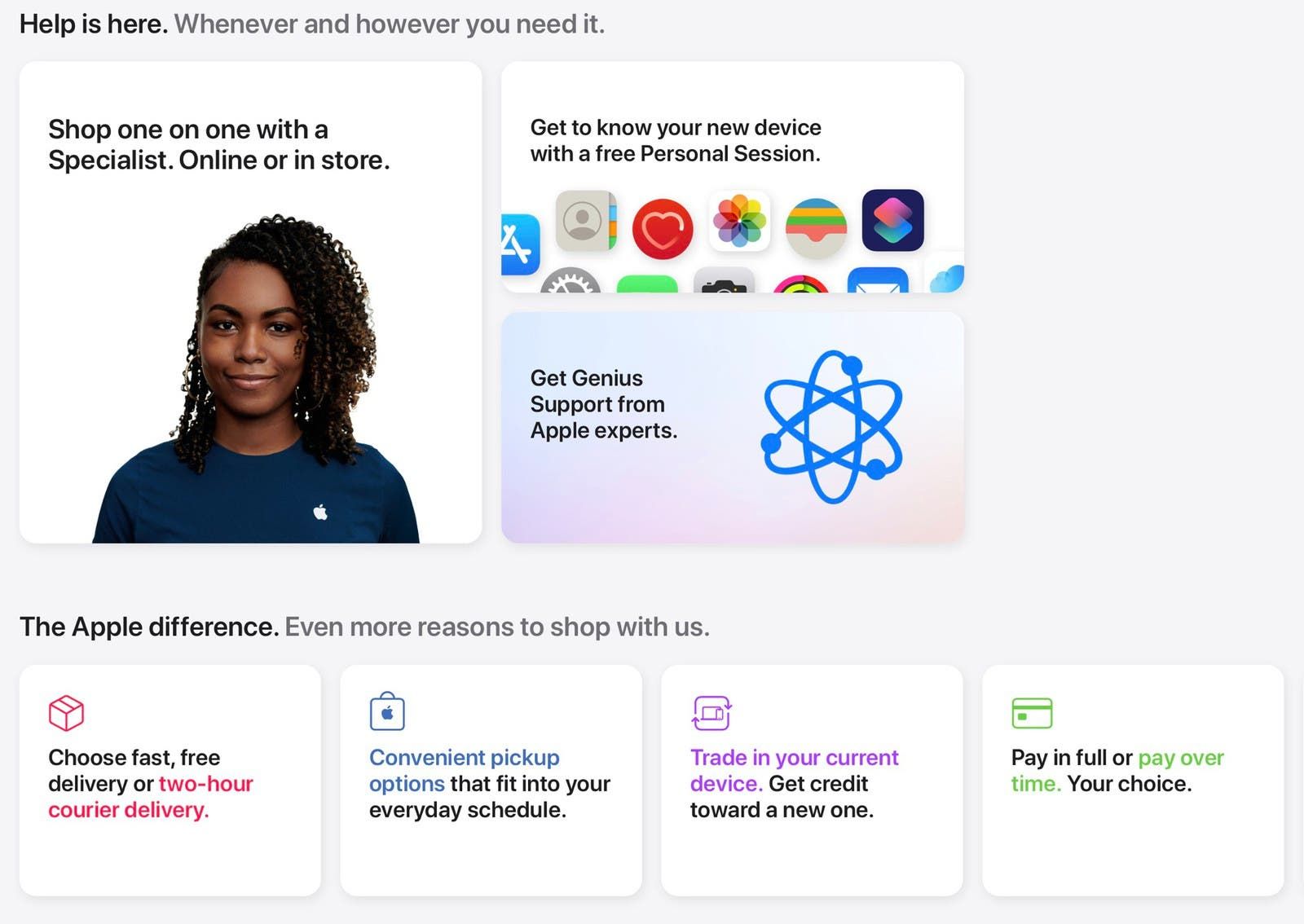 وتروج الشركة لنفسها من خلال مجموعة من البطاقات التي تروج لخدمات مثل "التوصيل المجاني" أو "التوصيل بالبريد السريع" و"الاستلام في المتجر" و"استبدال الأجهزة" وبطاقة Apple Card وتخصيص ماك و Apple Watch ونقش الرموز التعبيرية.