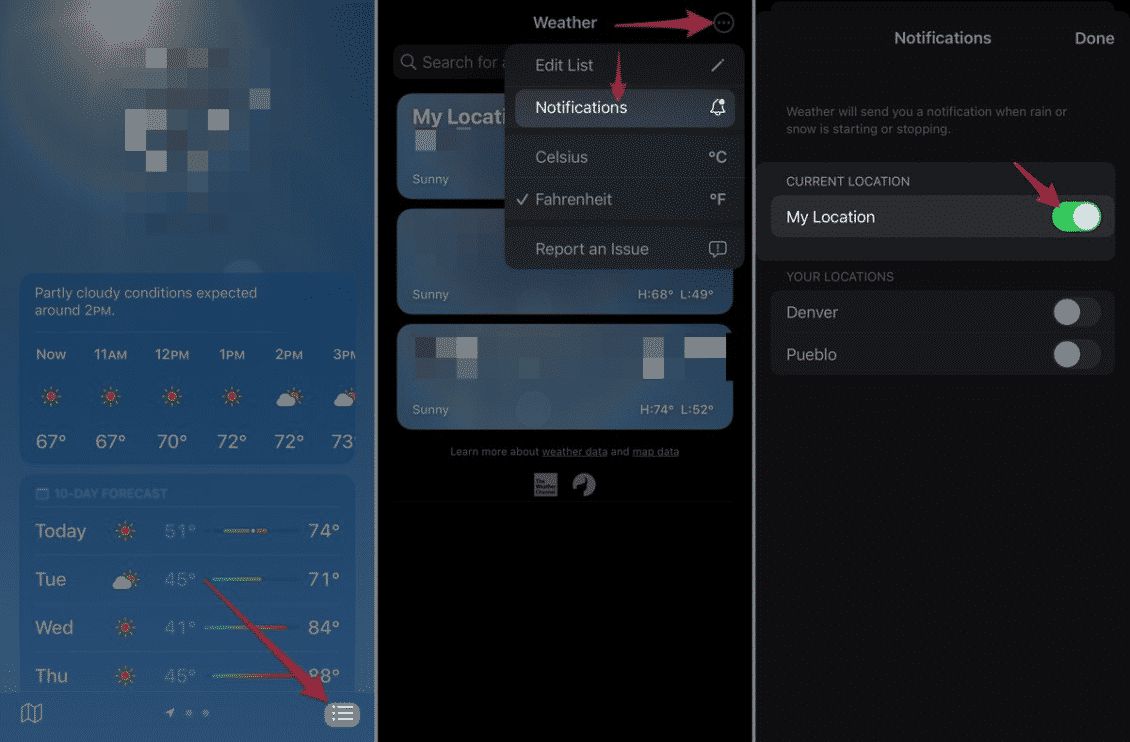 وتستطيع الحصول على تنبيهات حول تغير حالة الطقس باستمرار والمدة التي يتوقع أن يكون الطقس سيئًا فيها عبر تطبيق الطقس الرسمي. وذلك عبر اتباع الخطوات التالية: