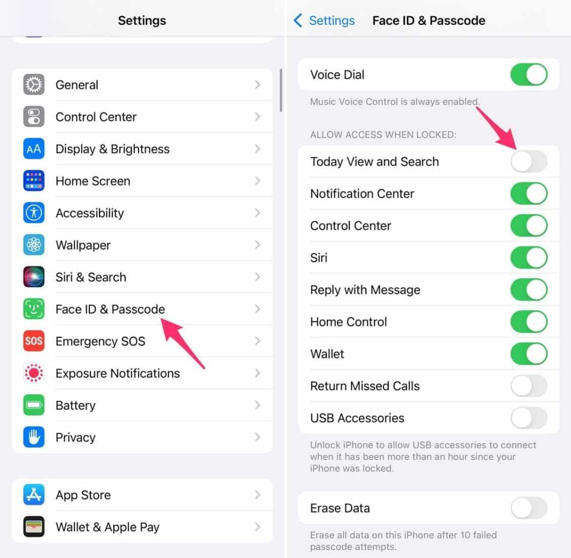 توجه إلى تطبيق الإعدادات ومن ثم اختر بصمة الوجه والرمز السري، وبعد ذلك تجد اختيارًا يدعى عرض اليوم ومربع البحث، لذلك قم بتفعيل هذا الاختيار.