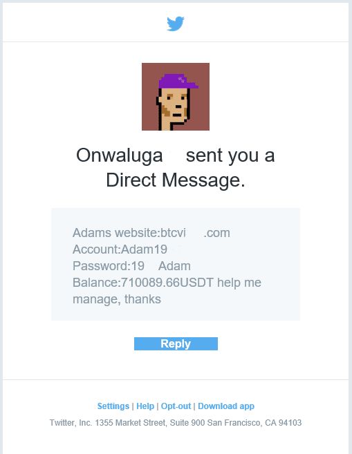 اكتشف باحثو شركة كاسبرسكي حملة بريد غير مرغوب فيه تنتشر من خلال الرسائل المباشرة على تويتر، مستهدفة سرقة العملات الرقمية للمستخدمين، الذين يُطلب منهم المساعدة في سحب مئات الآلاف من الدولارات من حساب العملة الرقمية لأحد مستخدمي منصة التواصل الاجتماعي الشهيرة.