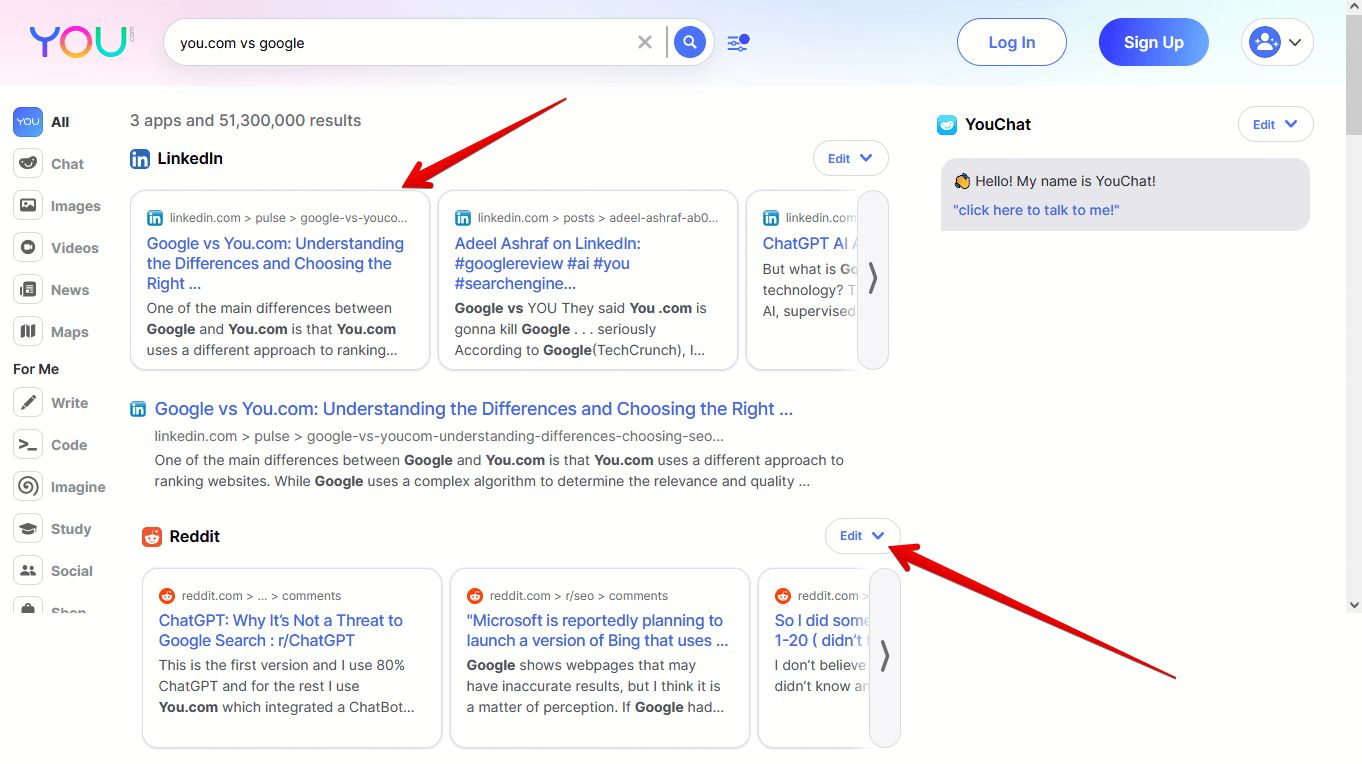 لذلك قدم محرك You.com أيضًا عناصر تحكم للمستخدم، حيث يمكن للمستخدمين إبداء الإعجاب أو عدم الإعجاب بالتطبيقات لمساعدة الخوارزميات في تصنيف عمليات البحث المستقبلية.