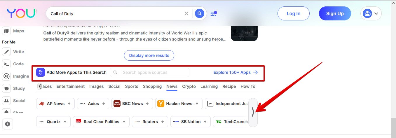 يحتوي محرك You.com على متجر تطبيقات، يظهر في أسفل كل صفحة نتائج، ومن خلاله يمكنك تحديد التطبيقات التي تظهر لك في نتائج البحث، فعلى سبيل المثال: إذا كنت تبحث عن لعبة (Call of Duty) فقد ترغب في البحث بسرعة في تطبيق يوتيوب أو Twitch. وإذا كنت تبحث بشكل متكرر عن الأخبار، فيمكنك إضافة مصادر محددة، مثل: (أسوشيتد برس) Associated Press أو رويترز.