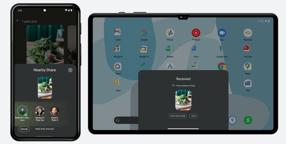 أطلقت جوجل ميزة (المشاركة القريبة) Nearby Share لأول مرة في عام 2020، لتوفير طريقة سريعة لمستخدمي نظام أندرويد لمشاركة المحتوى من أجهزتهم بسهولة وأمان سواء إرسال الملفات إلى جهاز آخر خاص بهم أو إرسال الصور ومقاطع الفيديو إلى أفراد العائلة والأصدقاء، أو إرسال المستندات إلى زملاء العمل.