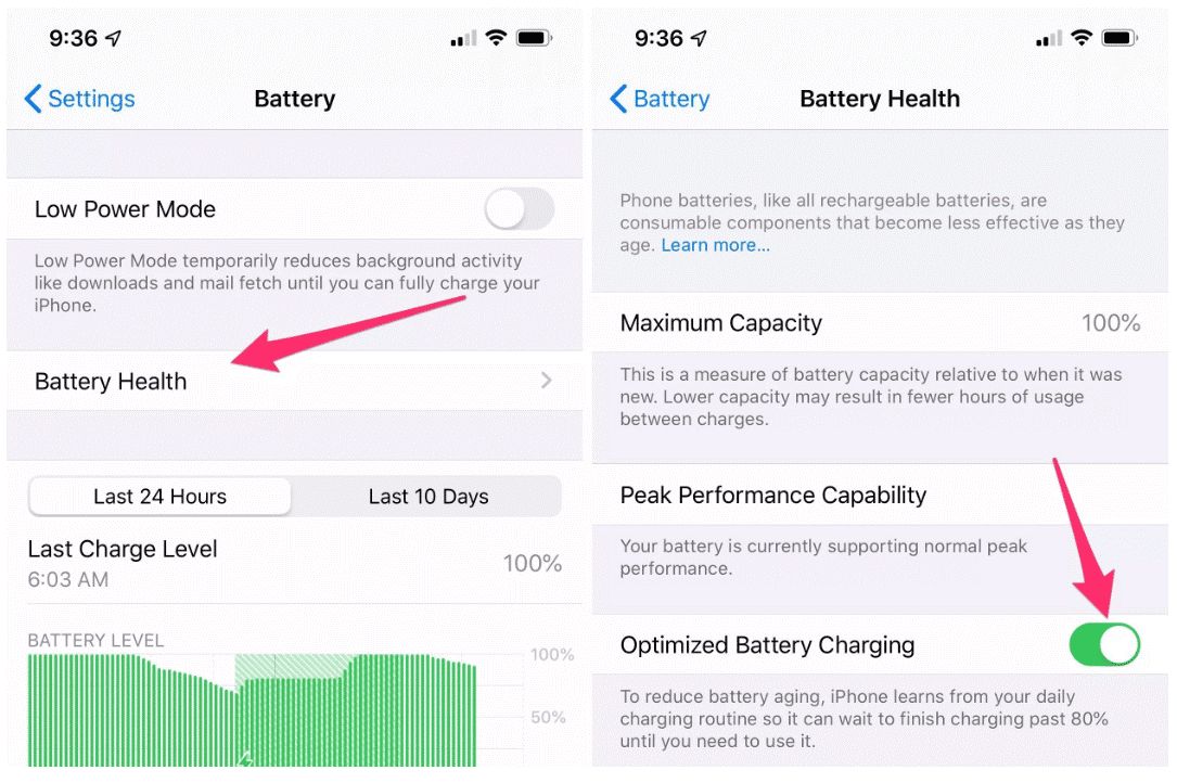 لذا إذا كنت من الذين يشحنون هواتفهم أثناء النوم، أتاحت آبل خيار شحن البطارية المحسن "Optimized Battery Charging"، الذي يُبقي بطارية الهاتف عند مستوى 80% لمعظم ساعات النوم، ثم إتمام العشرين بالمئة المتبقية من الشحن قبل استيقاظ المستخدم.