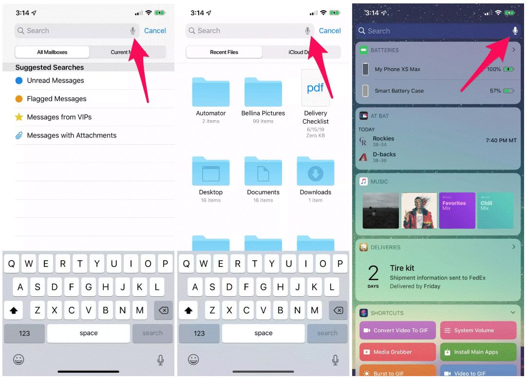 البحث عن طريق الصوت أصبح متاحاأصبح البحث أكثر سهولة، ففي أي تطبيق من تطبيقات آبل سيظهر رمز للميكروفون في الجانب الأيمن، وبالنقر عليه يستطيع المستخدم البحث عما يريد باستخدام صوته بدلا من الكتابة.