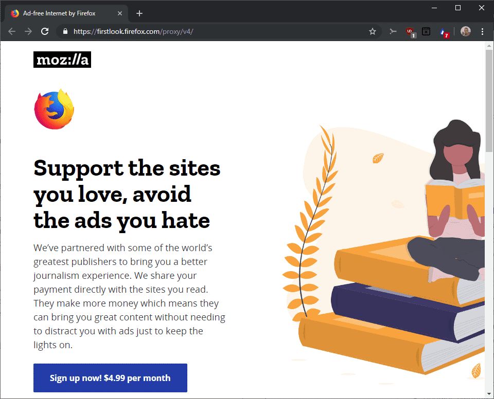 بدأت مؤسسة موزيلا – المسؤولة عن تطوير متصفح فايرفوكس – بالتشويق لخدمة اشتراك بالأخبار خالية من الإعلانات بالشراكة مع Scroll.com، وذلك مقابل 5 دولارات شهريًا، والتي تمنح المشتركين تجربة تصفح خالية من الإعلانات عبر عدد من المواقع الإخبارية المشاركة.