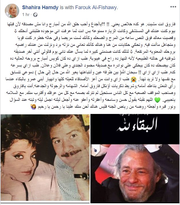 ونعت شهيرة الراحل بكلمات تعبر عن معدنه وشهامته ورجولته في كافة المواقف، معربة عن افتقادها الشديد له بعد رحيله.