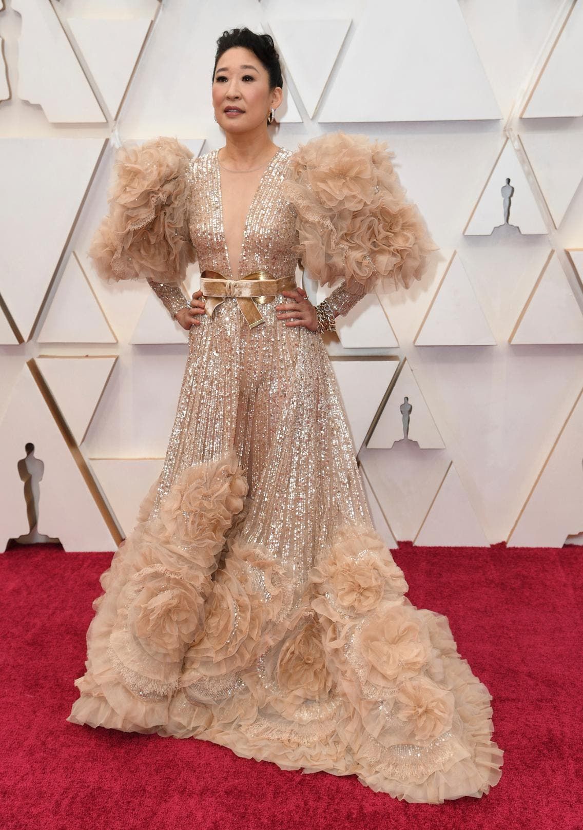 - اختارت الممثلة الكنديّة ساندرا أوه واحدة من الإطلالات الأكثر أناقة في حفل أوسكار 2020. وهي تألقت بثوب تزيّن بكمّين كبيرين غطّتهما الكشاكش وبحزام معدنيّ توسّطته عقدة مخمليّة. اختارت أوه إطلالتها من مجموعة دار Elie Saab لربيع وصيف 2020.