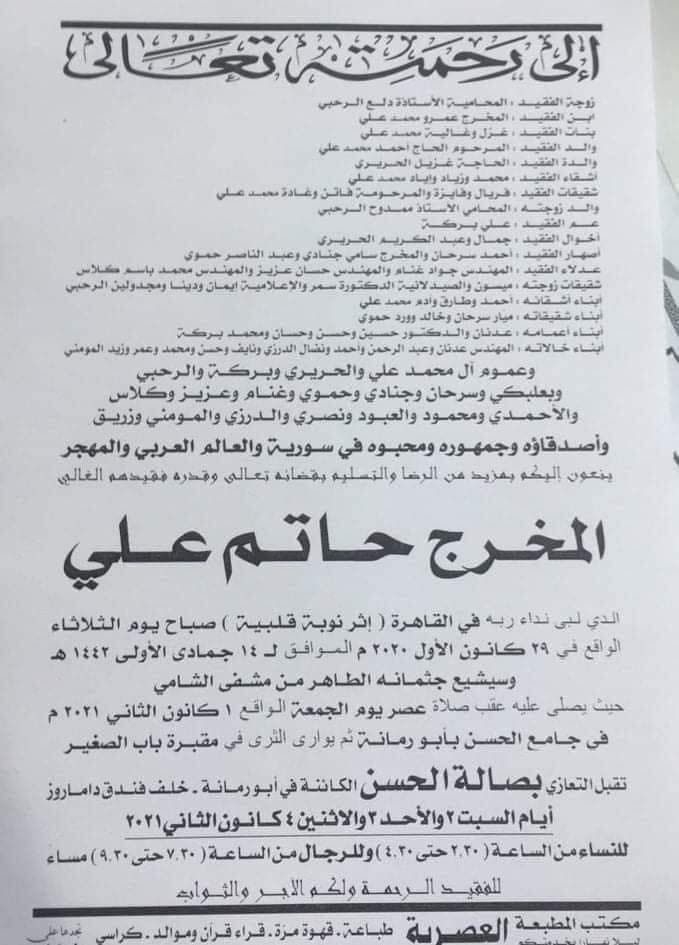 وورد في نعي أكبر المخرجين السوريين، أن علي سيشيّع جثمانه، من مستشفى الشامي، بدمشق، ويصلى عليه في جامع الحسن وهو المكان الذي سيتم تلقي التعازي فيه برحيله، بمنطقة "أبو رمانة" عقب صلاة يوم الجمعة، الواقع في الأول من شهر كانون الثاني 2021.