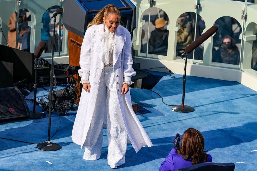 تخلل حفل تنصيب الرئيس جو بايدن مشاركة للنجمة جينيفر لوبيز التي أدّت مجموعة من الأغنيات الوطنيّة. وهي تألقت للمناسبة بإطلالة بيضاء حملت توقيع دار Chanel الفرنسيّة وتألفت من معطف من التويد نسّقته مع قميص مزيّن بالكشاكش وسروال ذات أقدام عريضة. وكمّلت إطلالتها بحذاء وحقيبة صغيرة بالإضافة إلى أكسسوارات من اللؤلؤ.