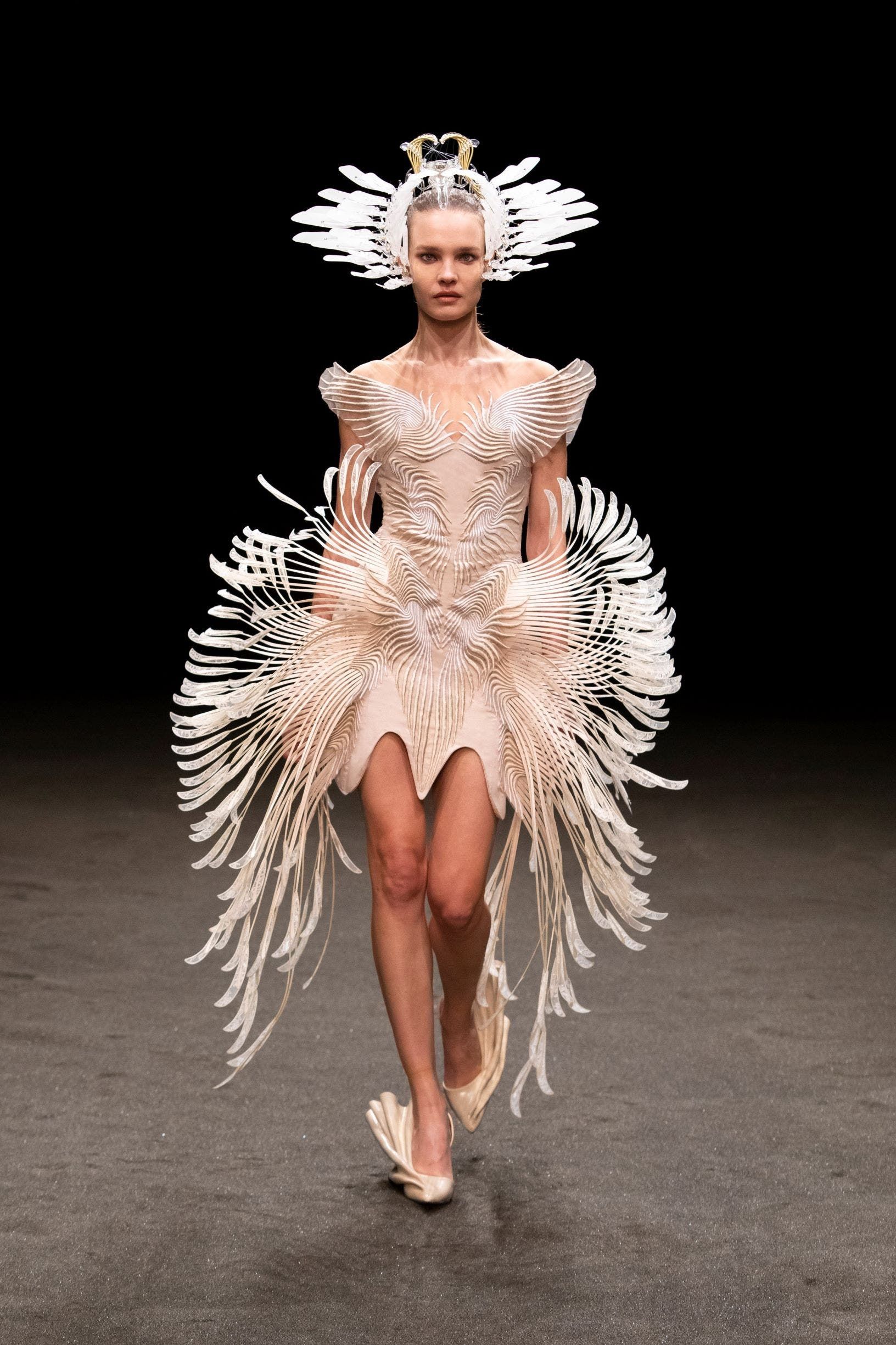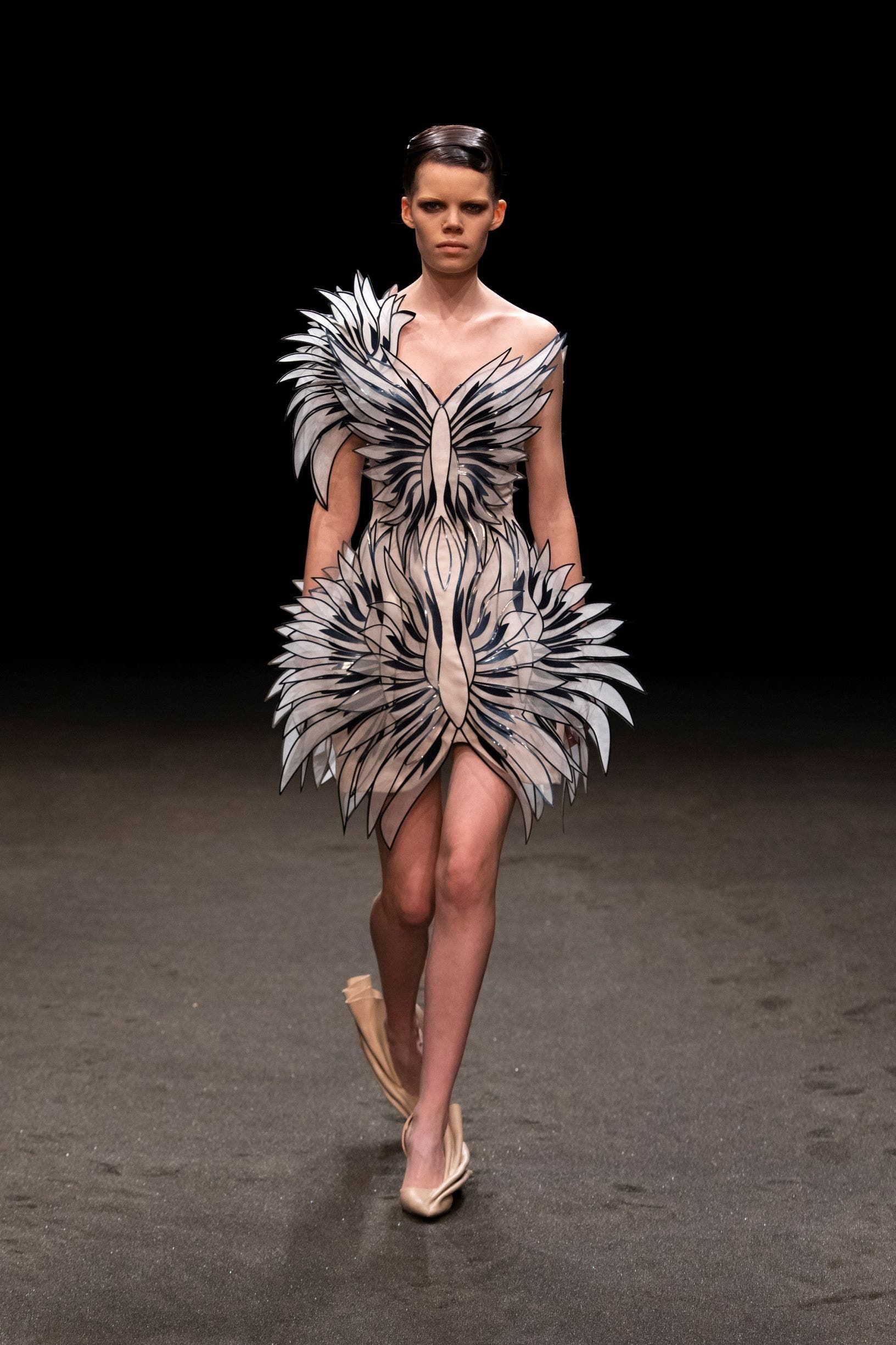 21 إطلالة تضمنتها هذه المجموعة التي سخّرت التكنولوجيا لخدمة الموضة وقدمت تصاميم تتميز بغرابة لافتة وإبداع فريد في الأفكار والتنفيذ.