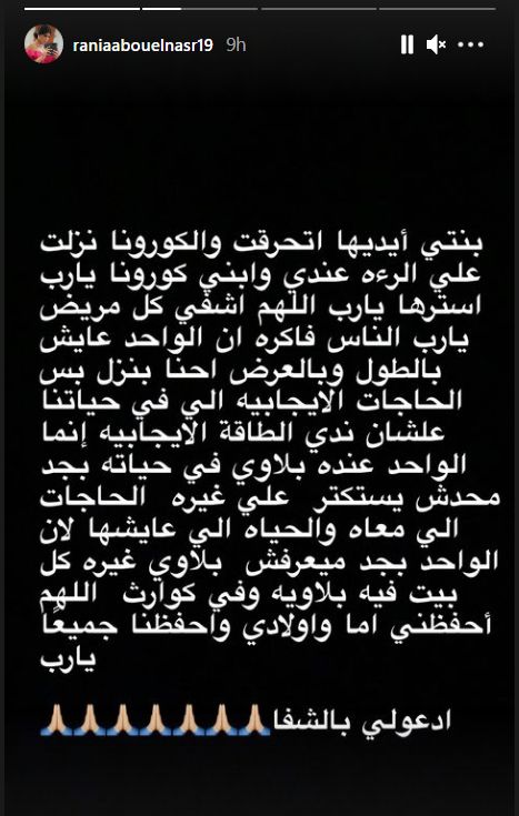 يذكر أن رانيا أعلنت إصابتها بفيروس كورونا الأسبوع الماضي، بعد يوم من إعلان إصابة ابنها آدم، وكتبت في منشور سابق بطريقة ساخرة "أنا كورونا بقالي 6 أيام، بس بجد أد ايه الكورونا أصيلة وقسمتها بالعدل ما بينا، قبل كده جوزي وبنتي مع بعض ودلوقتي أنا وابني مع بعض".
