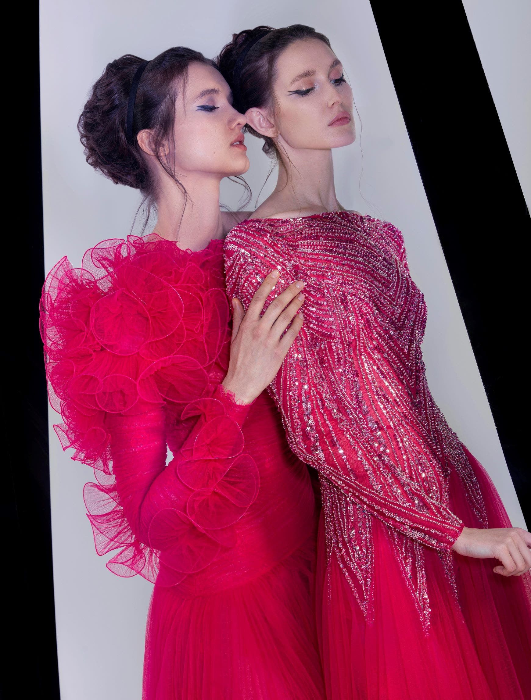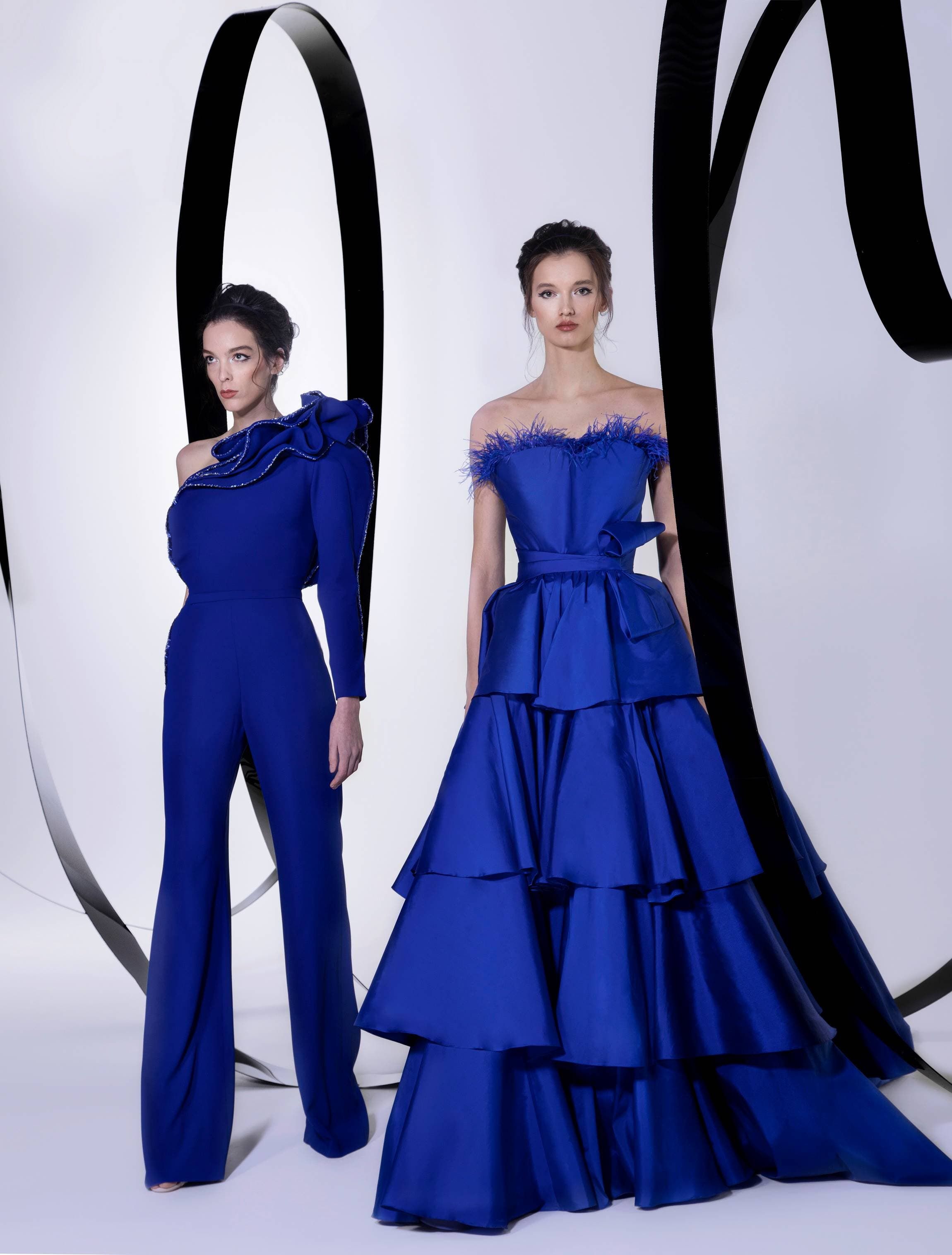 الألوان الطاغية على هذه التصاميم هي الأرجواني، والليلكي، والأخضر الزمردي، والأزرق النيلي، والأسود. أما الخامات فجأت بمعظمها منسدلة تلتفّ حول الجسم وتتزيّن بالتطريز اليدوي، شكّ الخرز، والريش.