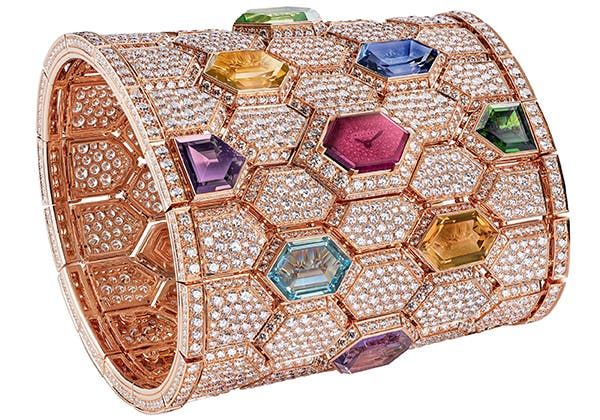 • ساعة Piaget Limelight Gala Precious Rainbow، قطرها 32 ملليمتر، مصنوعة من الذهب الوردي ومرصّعة على شكل قوس قزح بأحجار ملوّنة منها 37 حبة من الياقوت و5حبات من التسافورين.
