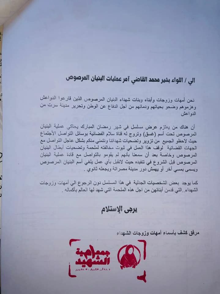 وبعد أيام من الترويج له وقبل البدء في بثه، تحركت قوات "البنيان المرصوص" ومنظمات الشهداء والمفقودين الذين لقوا حتفهم في الحرب ضد "داعش"، وطالبت بإيقاف هذا العمل التلفزيوني إلى أن يتم عرضه على قادة المحاور والقادة الميدانيين وأسر الشهداء وتتم موافقتهم عليه، حتى لا يتم تغيير الحقائق وتزوير التاريخ.