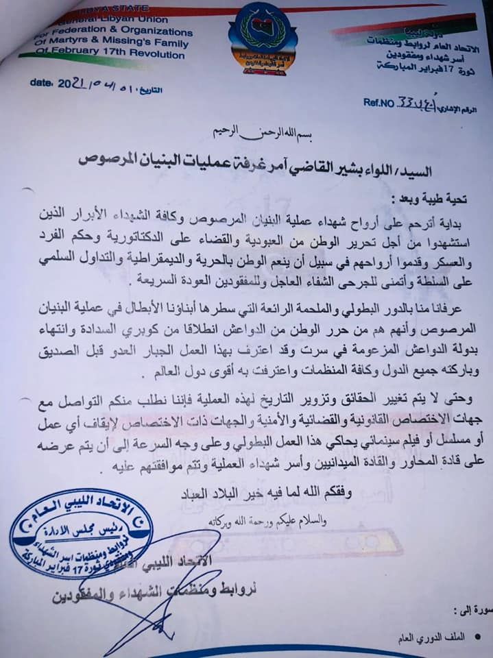 وأكدّت غرفة "البنيان المرصوص" في بيان أمس الاثنين، رفضها لأي عمل يجسد عملية "البنيان المرصوص" في سرت إلا بإذن من آمر العملية وآمري المحاور، وأوضحت أنها لم تصدر أي موافقة بإنتاج أو تصوير هذا العمل، ولم تشارك فيه بإعطاء أي معلومة أو قصة تحكي عن حدث وقع أو قصة في ملحمة البيان المرصوص، مشيرة إلى أن هذا العمل لم يعط حق المقاتلين المشاركين ولم يظهر إلا جزء بسيط وقليل مقارنة بالأعمال الإجرامية الوحشية لتنظيم داعش الذي أرهب الليبيين والعالم خلال فترة من الزمن.