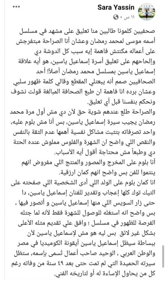 من جانبها وعبر تدوينة على صفحتها على مواقع التواصل علقت سارة ياسين، حفيدة الفنان الراحل على المشهد، وقالت إنها لا تلوم الفنان رمضان لأن تصرفاته تثبت أن لديه مشكلات نفسية أهمها عدم الثقة بالنفس، مضيفة أنها توجه اللوم للمخرج والمصور والمنتج الذين ينتمون للفن وسمحوا بالإساءة لفنان عظيم مثل جدها.