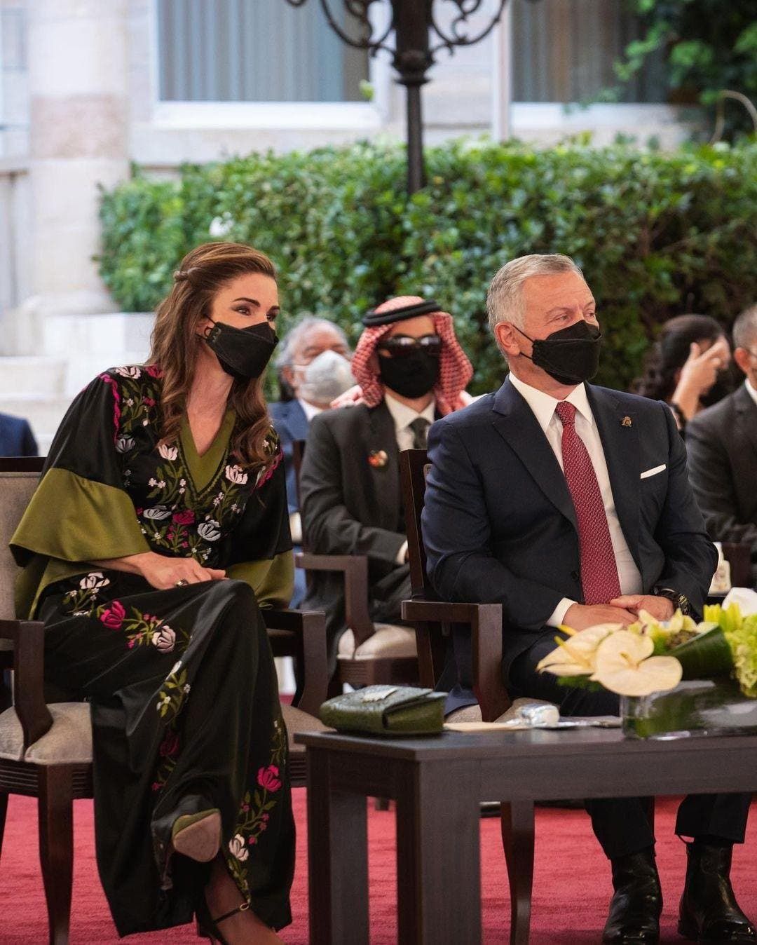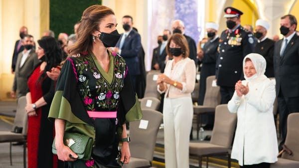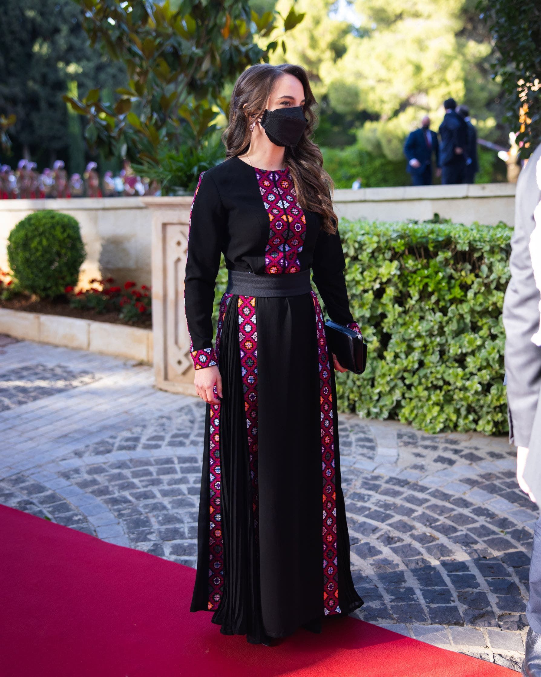 وقد كان لافتاً التناسق في الإطلالات بين الملكة رانيا وابنتها الأميرة إيمان التي ارتدت ثوباً أسود طويل يزيّنه حزام عريض عند الخصر وتطريزات تقليدية ملوّنة.