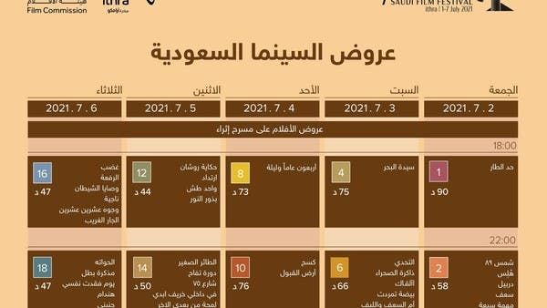 ويعرض المهرجان الذي يستمر 7 أيام، روائع السينما السعودية التي تتنافس على نيل جوائز المهرجان من خلال باقة من الأفلام التي تصل إلى 36 فيلمًا سعوديًا ما بين أفلام مرشحة للنخلة الذهبية، وأفلام موازية قصيرة وطويلة، و21 فيلمًا خليجيًا لتعزيز الترابط الفكري والمعرفي، وخلق بيئة لتبادل الأفكار بين المبدعين في صناعة الأفلام، كما ستقدم 4 ورش تدريبية في المجال السينمائي، و3 ندوات ثقافية، وسينما الصحراء، إضافة إلى نشر 6 كتب، تشمل كتبًا مطبوعة ونسخاً رقمية ضمن مسار الإصدارات المعرفية لهذا العام، إذ ستعرض جميع البرامج عبر قناة المهرجان على اليوتيوب.