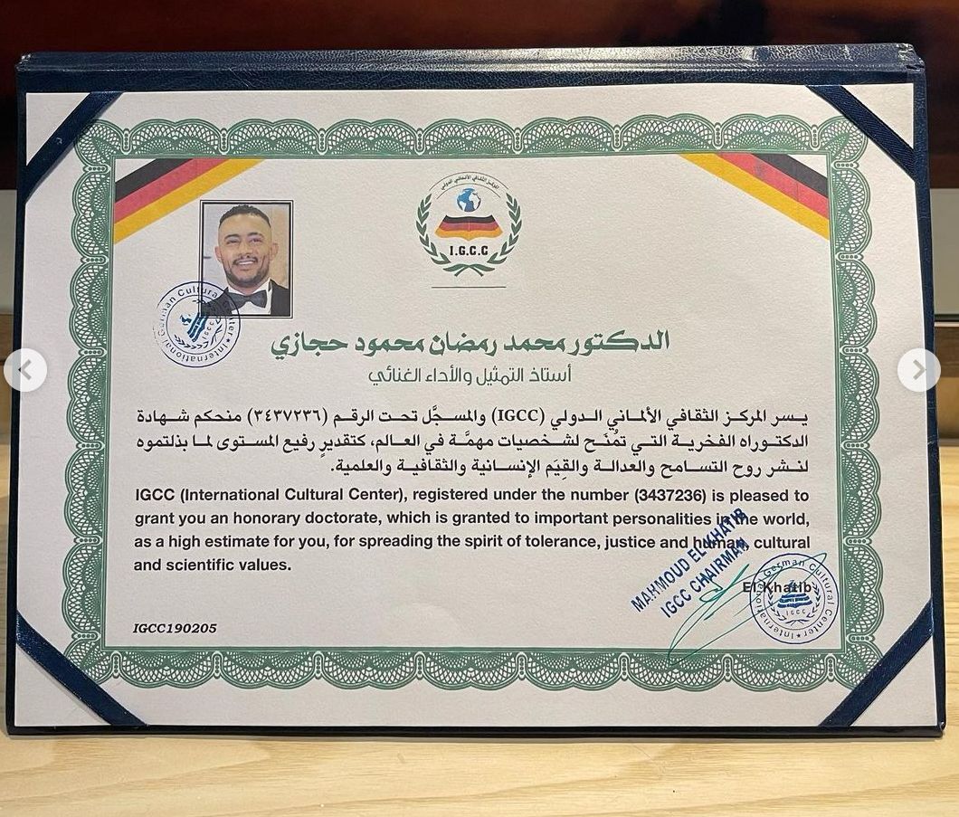 وكان الفنان محمد رمضان، قد نشر عبر حسابه الرسمي على موقع "إنستغرام" صورة لشهادة دكتوراه فخرية، وصورًا خاصة له مع بعض الفنانين اللبنانيين، معلقا: "شكرا معالي وزير الثقافة اللبناني، ونقيب الموسيقيين، ونقيب الممثلين اللبنانيين على منحي الدكتوراة الفخرية في التمثيل والأداء الغنائي، وشكرا المركز الثقافي الألماني في لبنان، على منحي لقب سفير الشباب العربي".