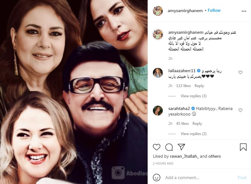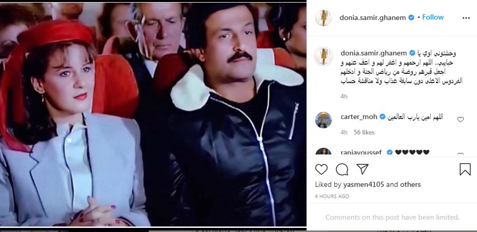 في الجهة الأخرى، قامت دنيا الشقيقة الكبرى بأمر مشابه، بعدما نشرت صورة تجمع والديها في أحد الأعمال الفنية، وعلقت عليها قائلة "وحشتوني أوي يا حبايبي.. اللهم ارحمهم واغفر لهم".. وتابعت في الدعاء للثنائي الراحل.