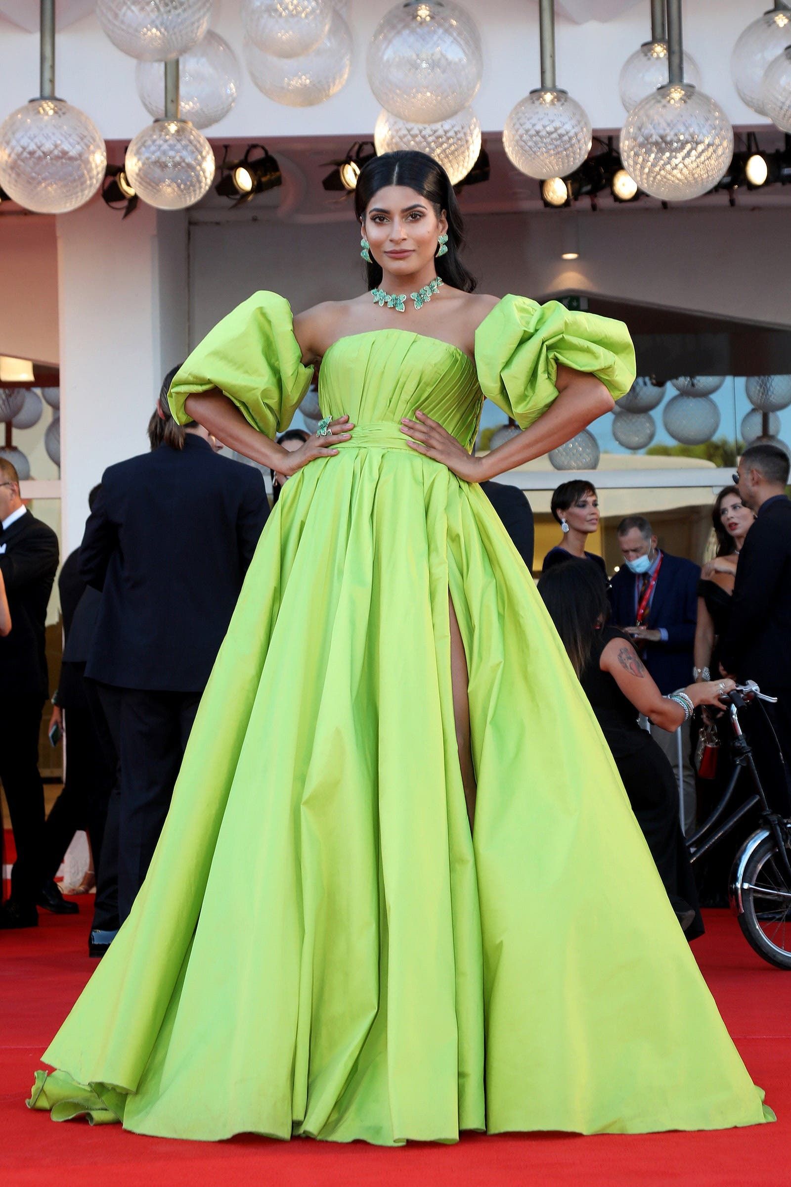 - اعتمدت المؤثرة الهندية فهرانا بودي ثوباً طويل باللون الأخضر ترافق مع كمّين ضخمين ومجوهرات ماسية تزينت بأحجار الزمرد. وقد حملت إطلالتها توقيع Aden Fashion.