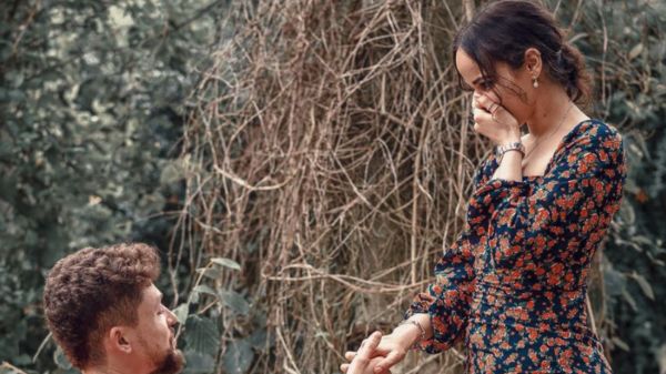 ونشرت نور عمرو دياب صورتين على حسابها في إنستغرام الثلاثاء، إحداهما للخاتم، والثانية ظهر فيها كيران وهو راكع أمامها.