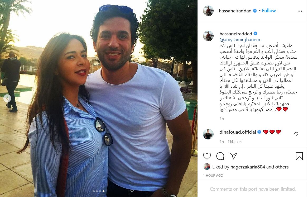 وأنهى الرداد رسالته بهذه الكلمات وانهالت التعليقات الداعمة لزوجته في مصابها الأليم، وشارك العديد من الزملاء في تعليقات الدعم، ومن بينهم شيكو ودينا فؤاد ودارين حداد وبسمة وهنا شيحة وعدد كبير من النجوم والجمهور.
