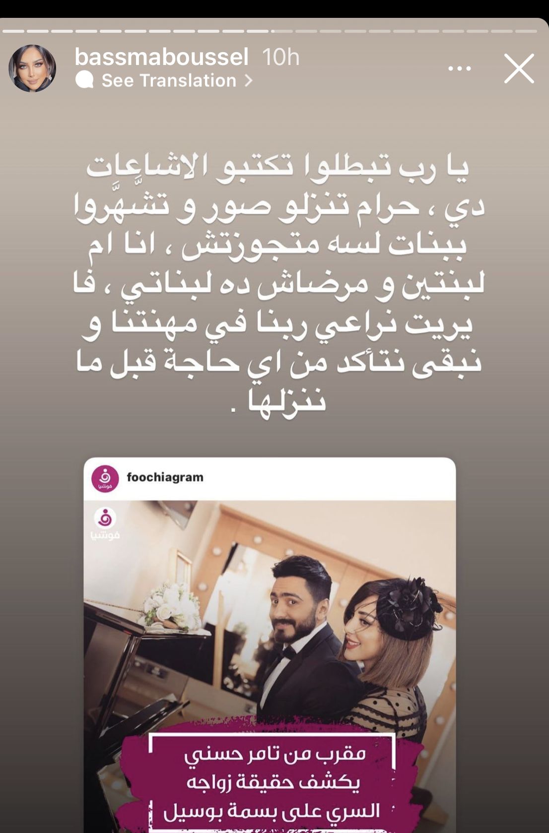 جاء ذلك بالتزامن مع منشور شاركته بسمة عبر حسابها على خاصية "قصص انستغرام"، لتقوم بحذفه لاحقاً كتبت فيه "يارب يخلصني من الناس المنافقة الخاينة اللي في حياتي"، وهو ما جعل البعض يربط بين الشائعة والمنشور.