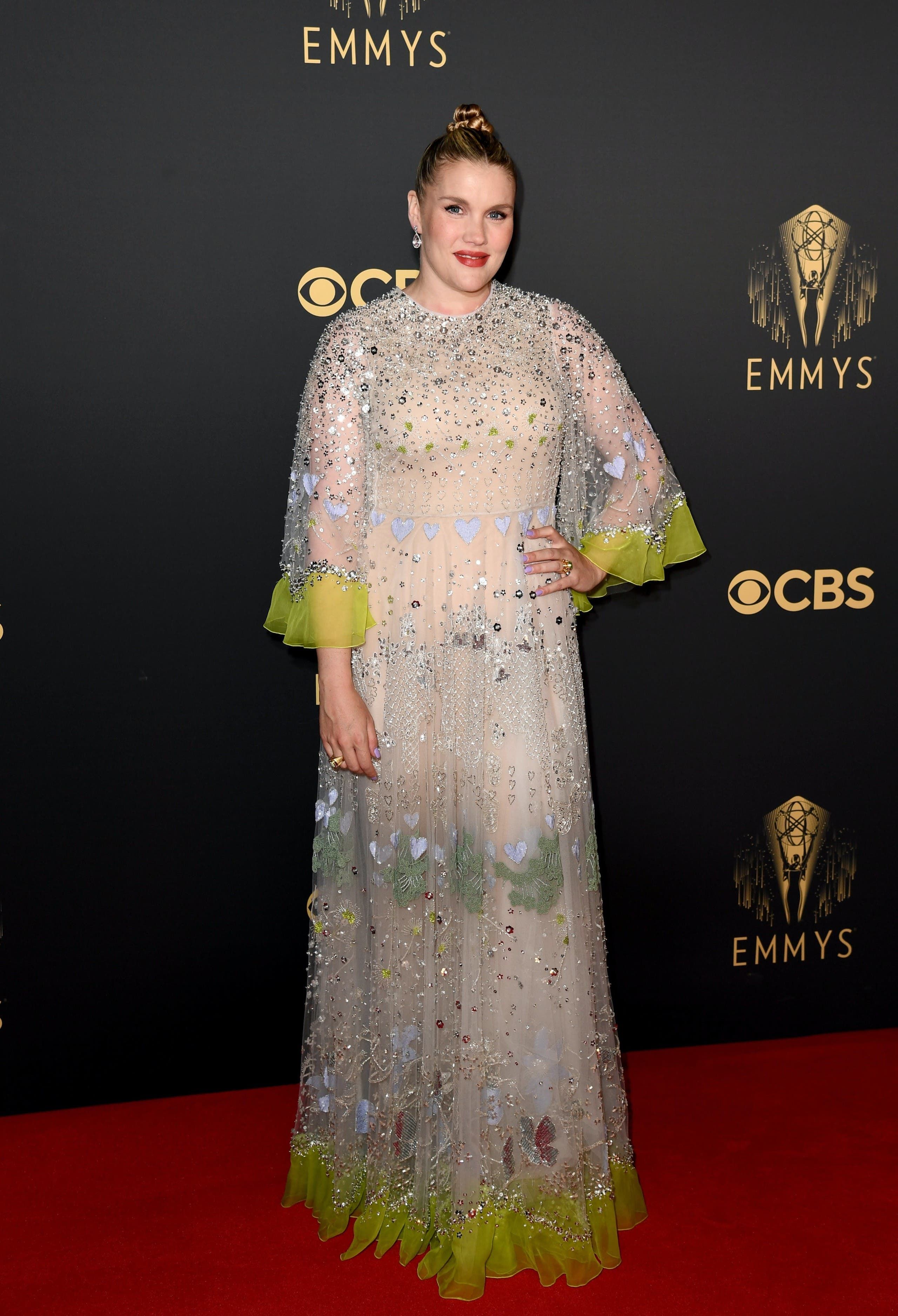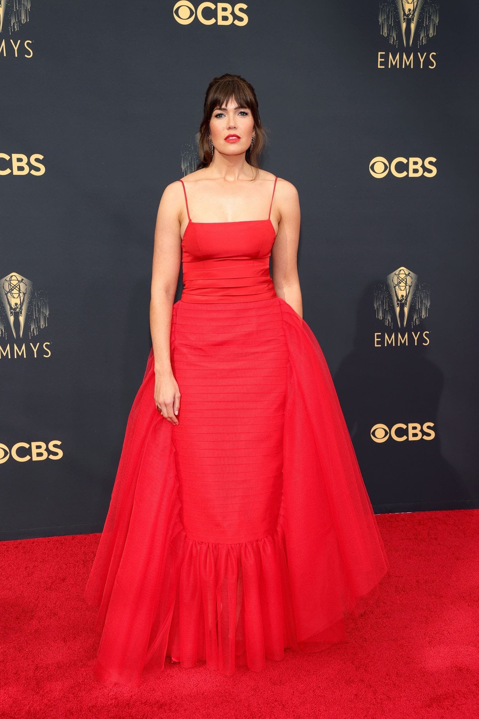 تألّقت النجمة ماندي مور بثوب أحمر طويل حمل توقيع دار Carolina Herrera، تميّز بتنورته الضيقة والطويلة المرفقة بالتول المنسدل من الخصر إلى الجزء الخلفي منه.