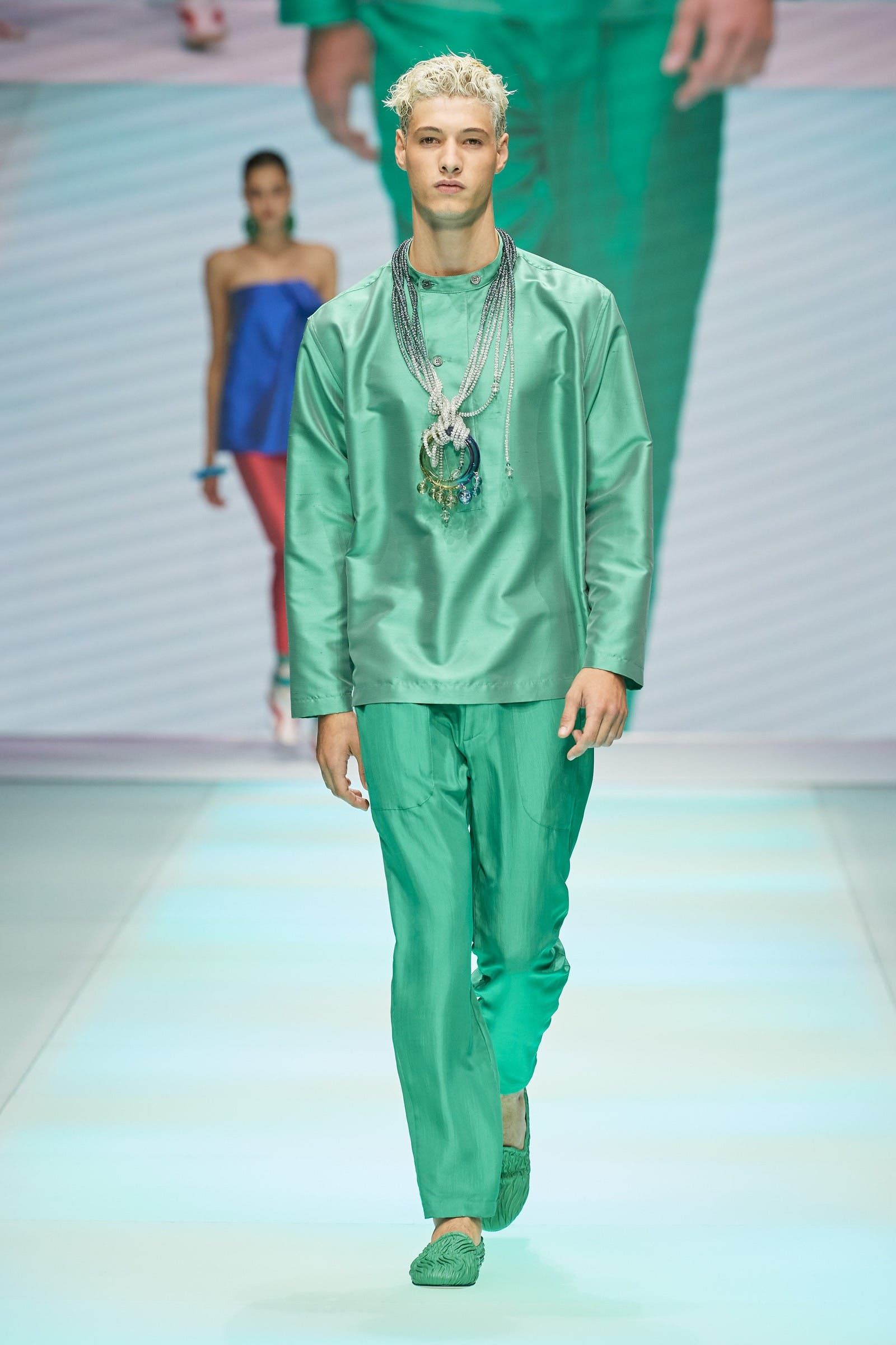 بعد مجموعة إطلالات الدنيم التي افتتحت العرض، توالت التصاميم التي اختلط فيها الطابع الرياضي بالقصّات الكلاسيكيّة. وقد رأينا السراويل الواسعة التي اختلطت مع قمصان أو سترات بألوان هادئة، استعان المصمم بعد ذلك بلعبة الشفافية والأزياء التي يتمّ ارتداؤها فوق بعضها البعض متجهاً نحو الألوان المنعشة للأزرق الفاتح، الأخضر المائي، والليلكي. ليتغيّر المزاج في القسم الأخير من العرض مع دخول اللون الأحمر على الساحة ليختلط مع الأخضر والفيروزي.