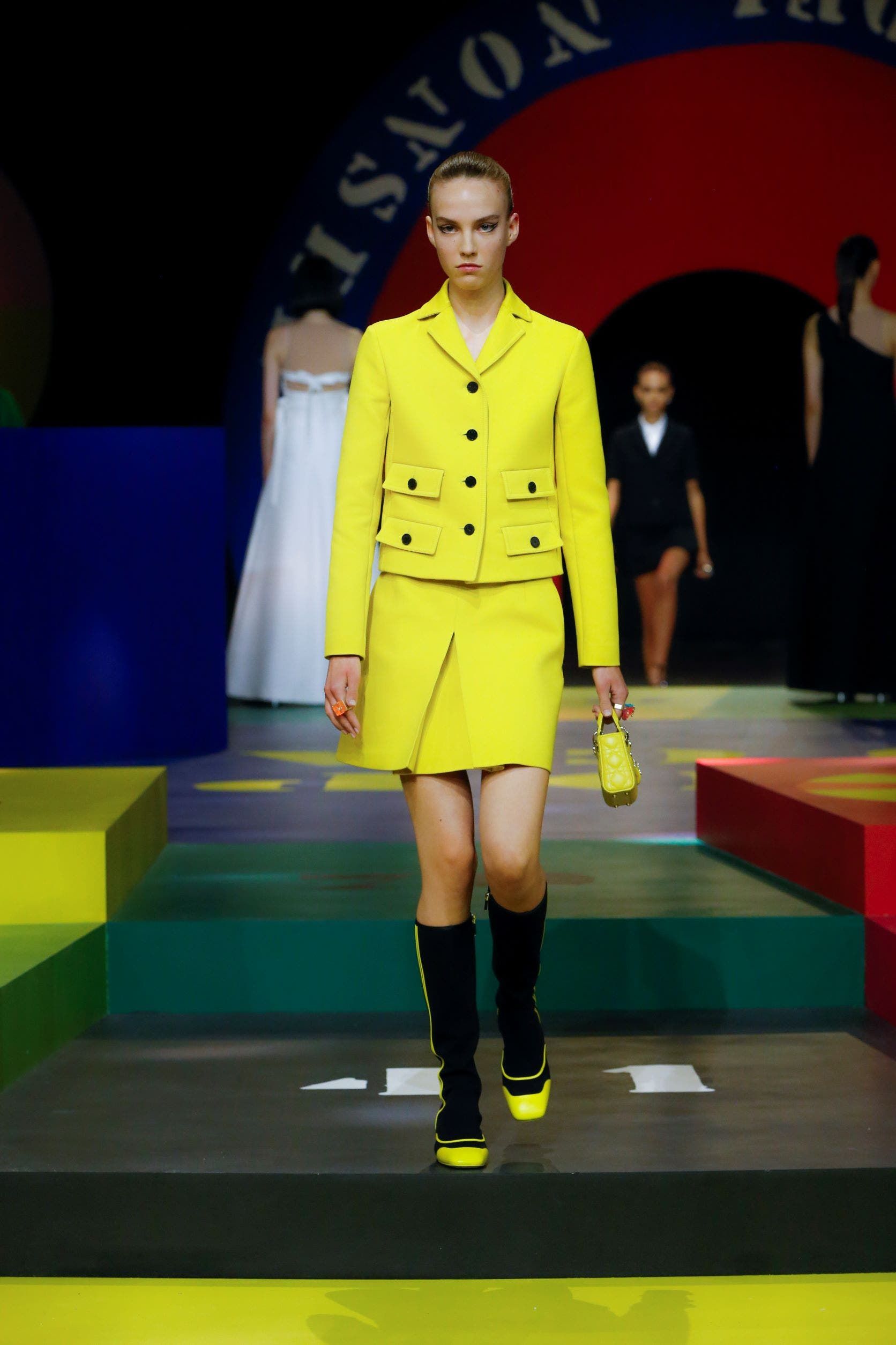 فيما استعانت ماريا غرازيا كيوري، المديرة الفنيّة الحالية للدار، بفترة الستينيّات لرسم أشكال التغيير وإطلاق قاموس جديد في مجتمعنا الذي ما زال مضطرباً بسبب الوباء. وهي استعانت بألوان الأصفر، والأخضر، والأحمر، والأزرق، والبرتقالي لتبتكر لعبة عبثيّة مرحة شكّلت الإطار العام لتقديم أزيائها على المسرح في عرض مباشر.