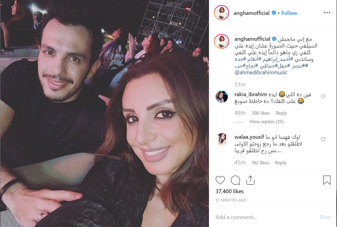وعلقت أنغام على الصورة قائلة "مع إني ما بحبش السيلفي.. حبيت الصورة عشان إيده على كتفي زي ما هو دايما إيده على كتفي وساندني".