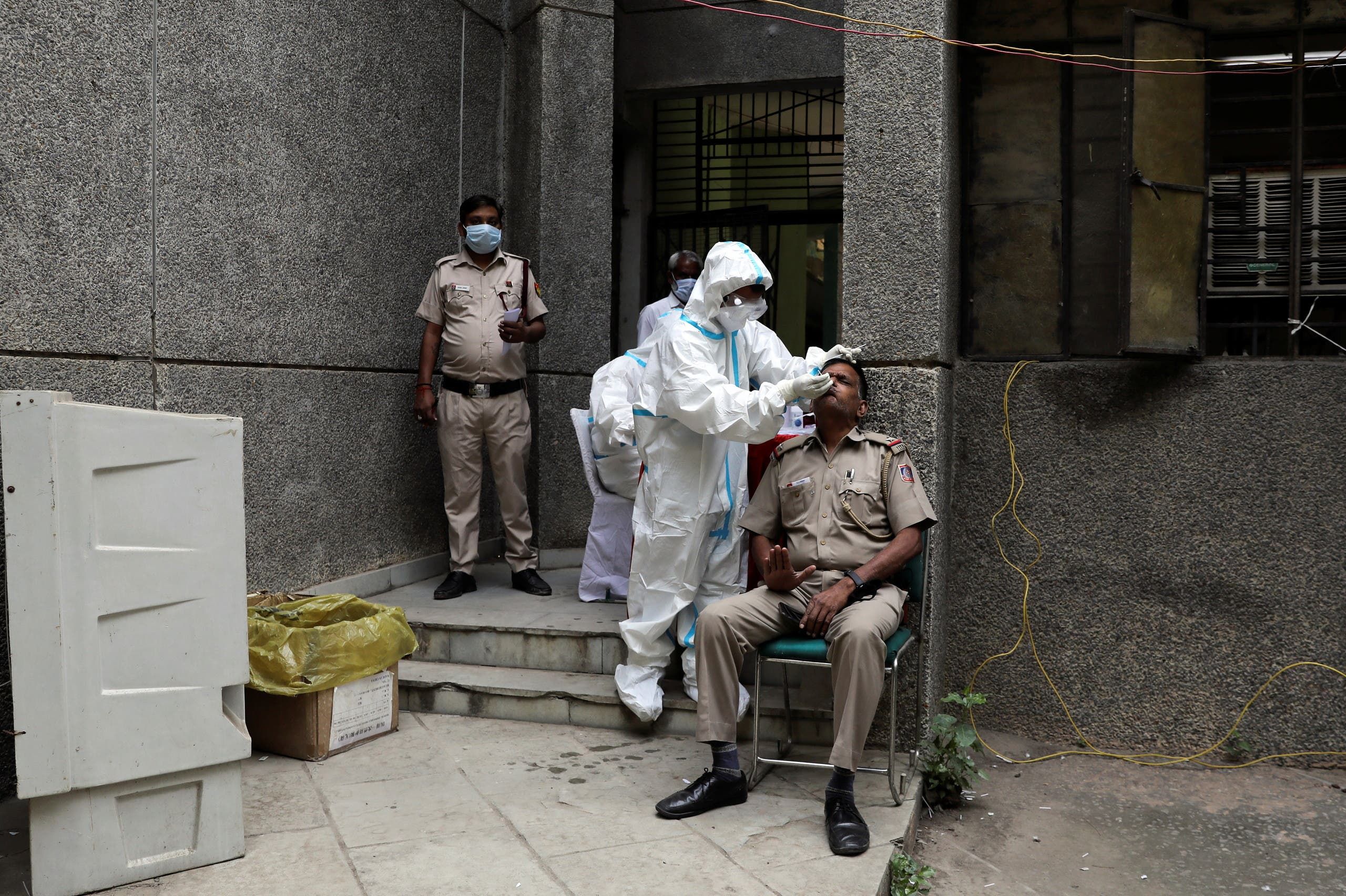 شرطي يخضع لفحص كورونا في نيودلهي