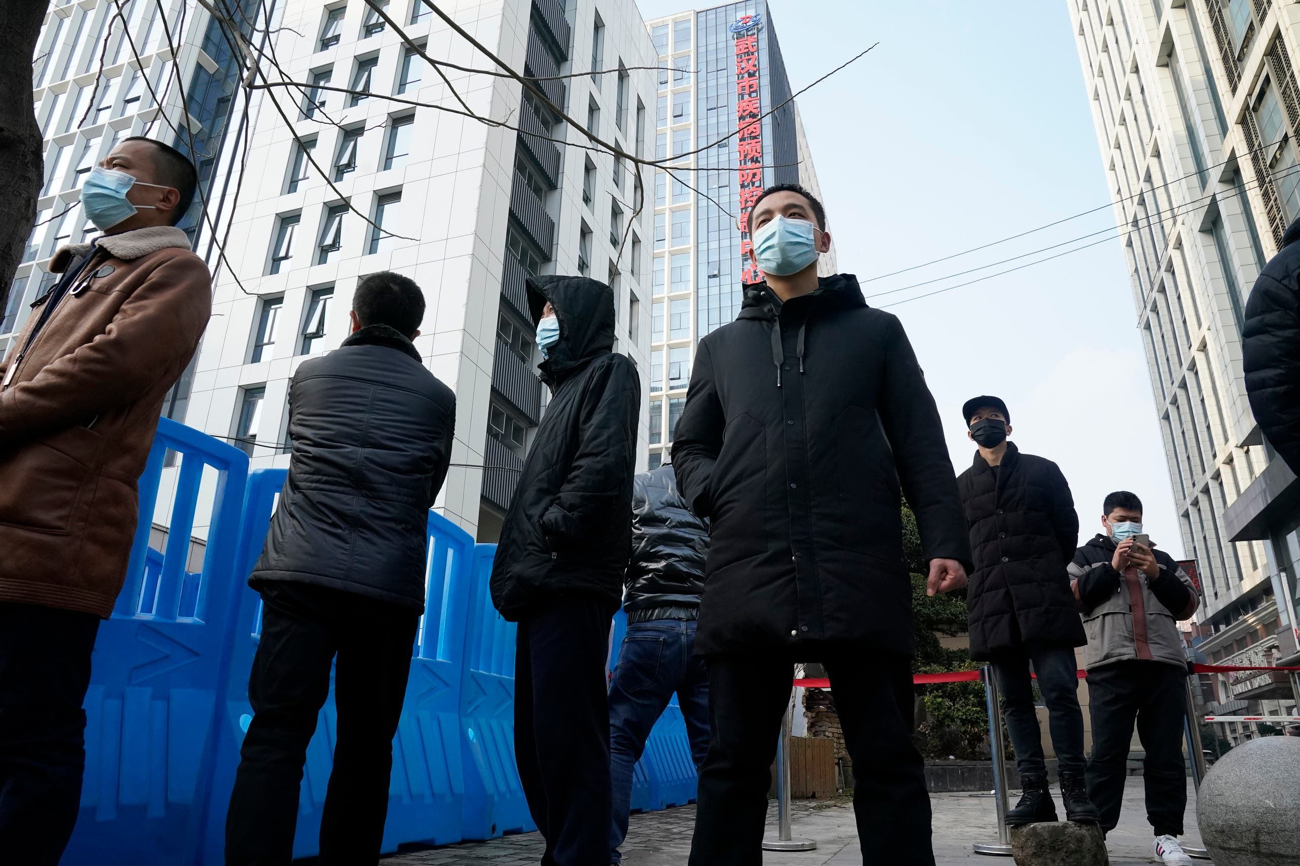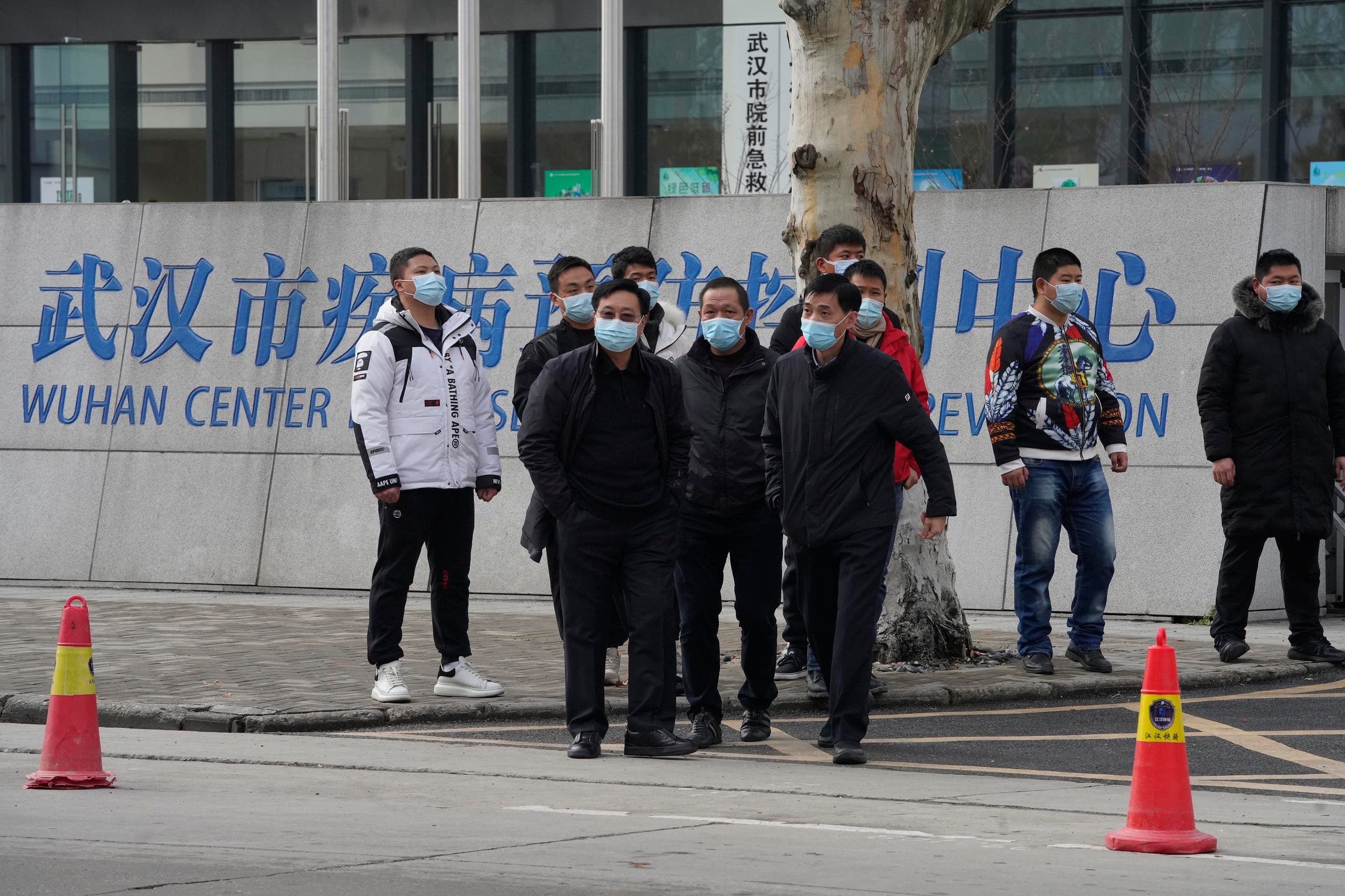 أفراد الأمن في ثياب مدنية خارج مركز ووهان للسيطرة على الأمراض والوقاية منها قبل وصول فريق منظمة الصحة العالمية يوم 1 فبراير