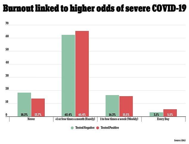 أفاد حوالي 5.5% من العاملين في مجال الرعاية الصحية، الذين أصيبوا بمرض كوفيد-19، بأنهم كانوا يعانون من الإرهاق يوميًا مقارنة بنسبة 3% من العمال غير المصابين بالعدوى.