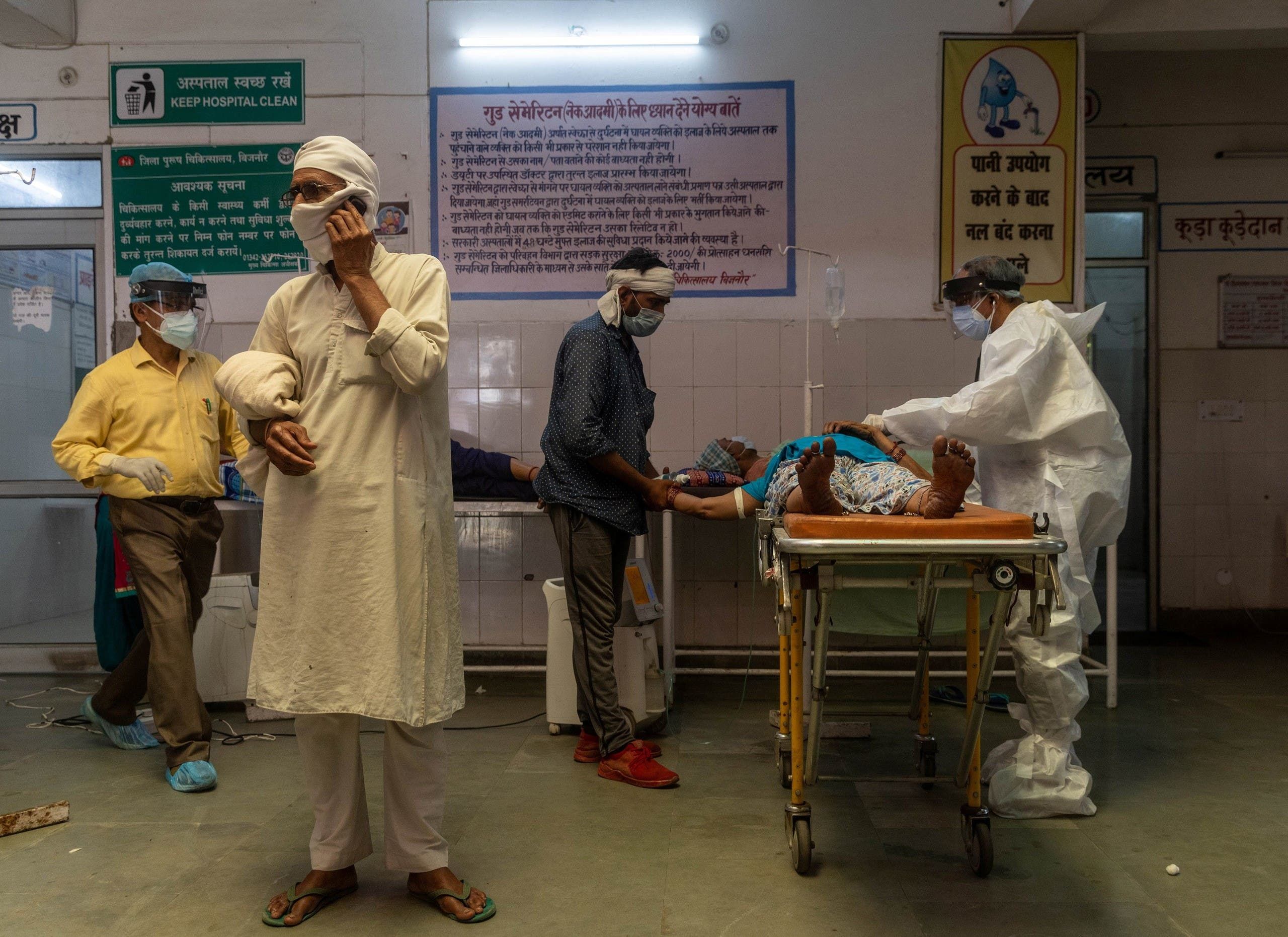 رجل يتحدث على الهاتف بينما تحاول طبيبة في أحد مستشفيات بجنور بالهند انعاش زوجته
