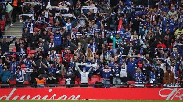 الجمهور يتابع مباراة بين ليستر وتشيلسي في ملعب ويمبلي في 15 مايو الماضي